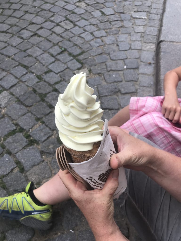 Wir bewegen uns Richtung Burg und da fällt unser Blick auf einen kleinen Laden mit einer tschechischen Spezialität. Trdelník.