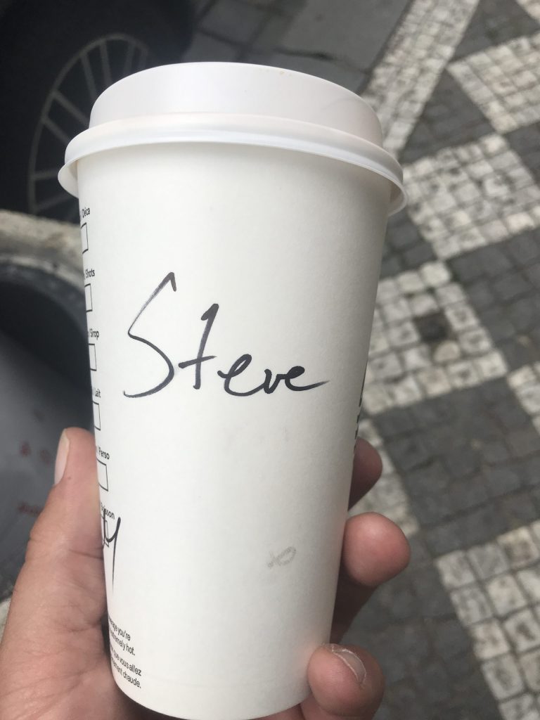 Dazu ein Kaffee einer bekannten Kaffeekette, die bei uns ja bekanntermaßen ein Running-Gag ist, wegen des angegebenen Names 🙂