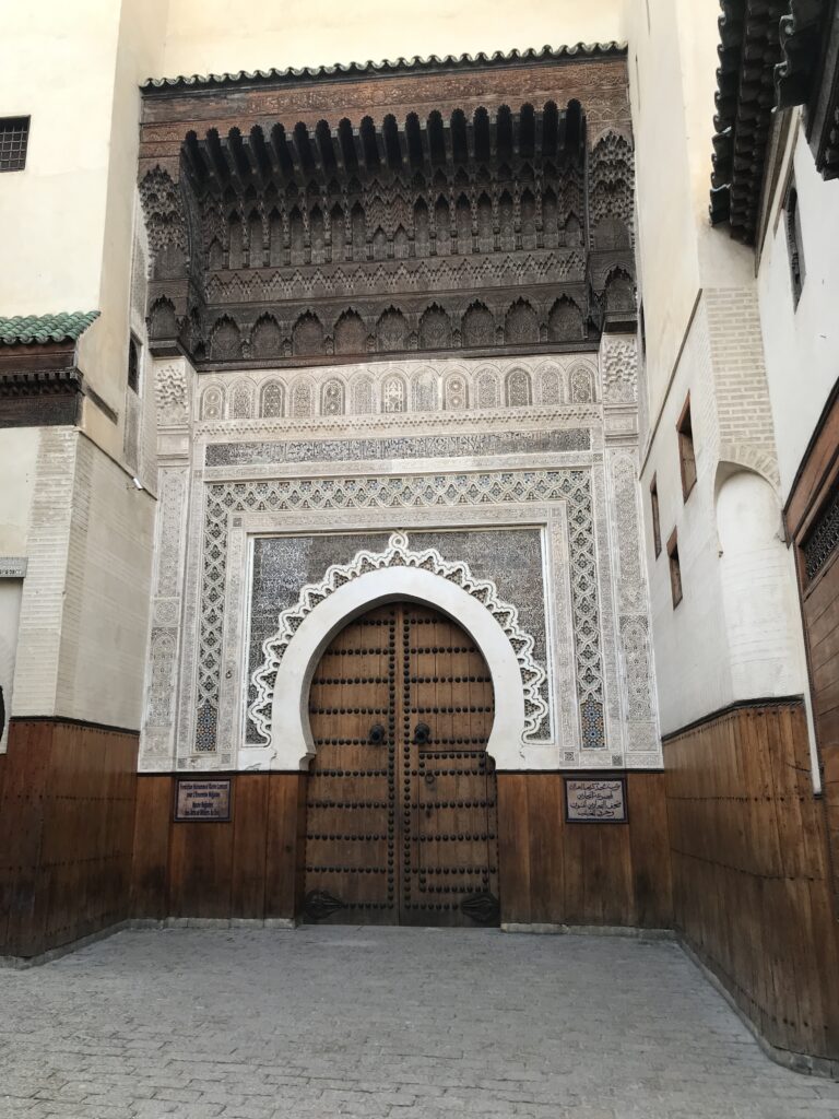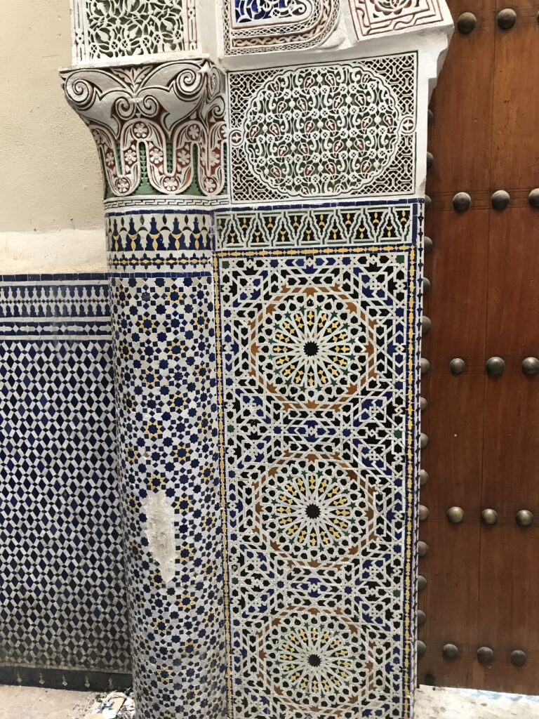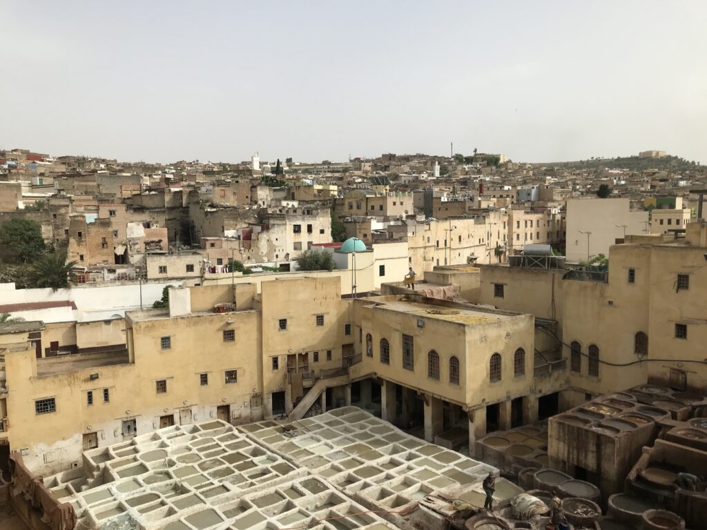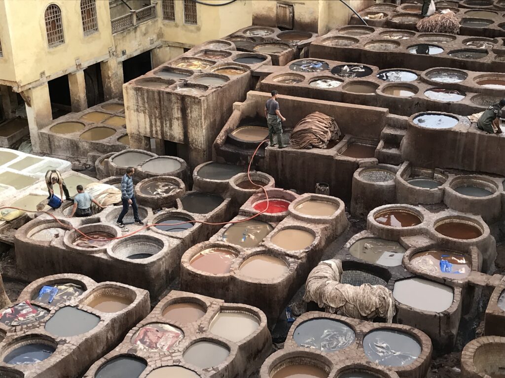 Vorbei an prunkvollen Toren (meist einer Moschee, die wir nicht betreten dürfen), an Brunnen und kleinen Läden geht es ins Gerberviertel. Dort bekommen wir frische Minze in die Hand, falls die Gerüche zu schlimm werden. Immerhin gerben sie mit Taubenmist.