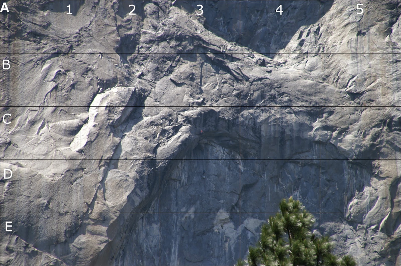 Also ich habe 2 Kletterer entdeckt. Nr 1 ist C3 mit roter Jacke und unten drunter in D3 hängt einer mit einer blauen Jacke.