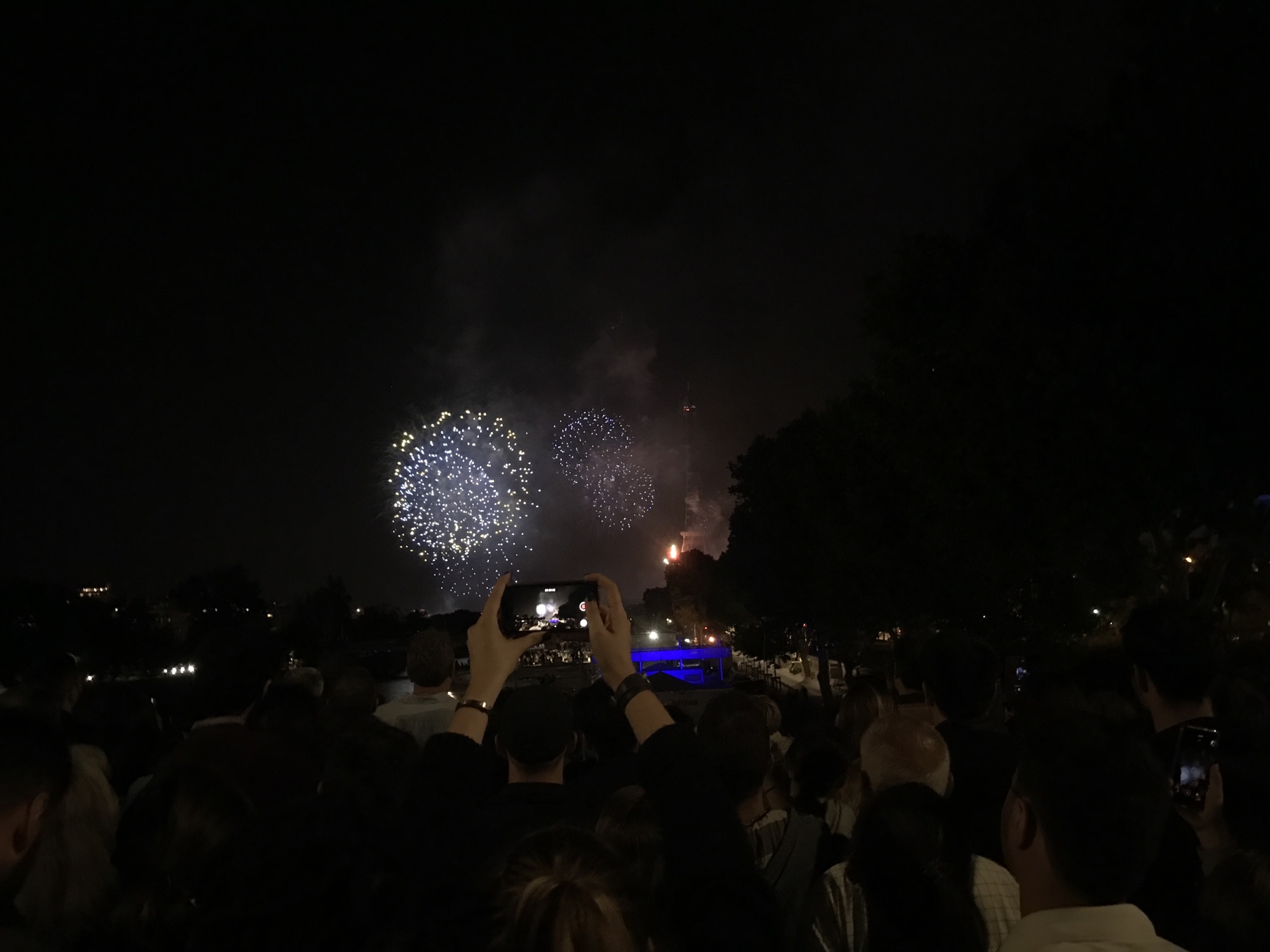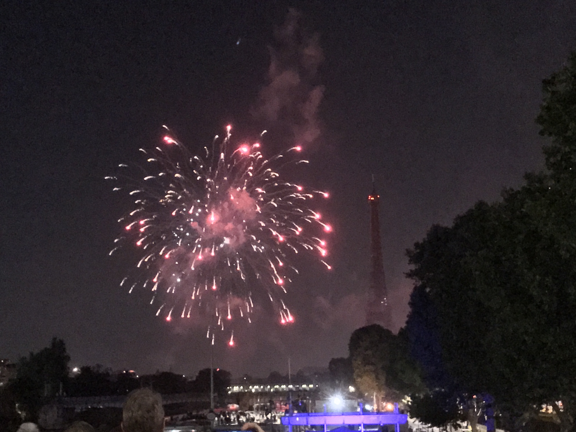 Am 14. Juli ist, wie wir jetzt wissen, der Nationalfeiertag mit Zeremonien und TamTam, Militärparade und Staatsbesuch (Fr. Merkel) und einem riesigen Feuerwerk am Eifelturm. Das lasse ich mir nicht entgehen. Also abends mit dem Zug zum Bahnhof Javel und von dort aus zu Fuß Richtung Eifelturm. Es ist 22.45 Uhr und die Straßen sind schon jetzt verstopft.