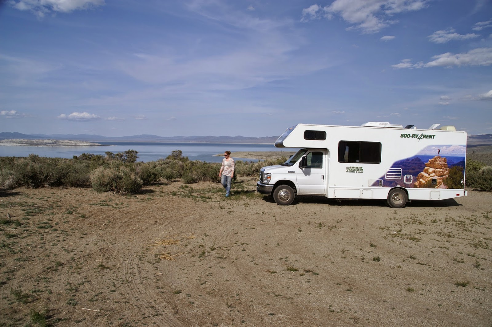 Da es schon spät war haben wir an einem kleinen Sandplatz nahe des Ufers angehalten. Kein Schild, daß man hier nicht stehen darf, also bleiben wir und haben damit eine eher seltene Macht ohne Campground aber dafür mit tollem Blick auf den Mono Lake.