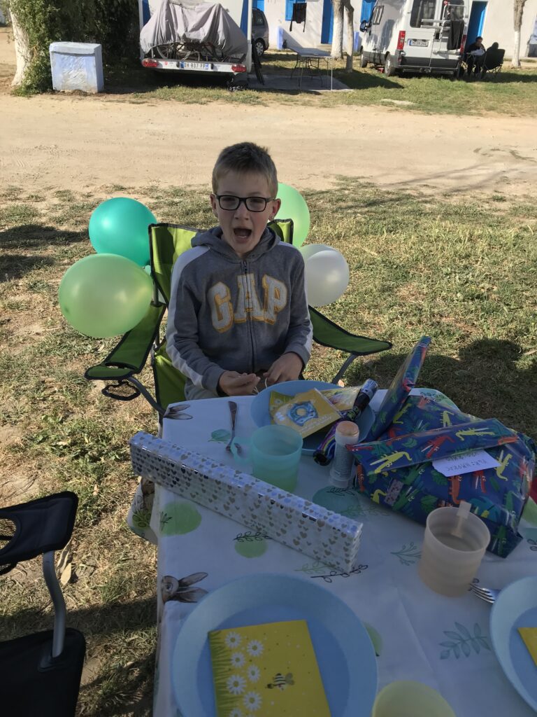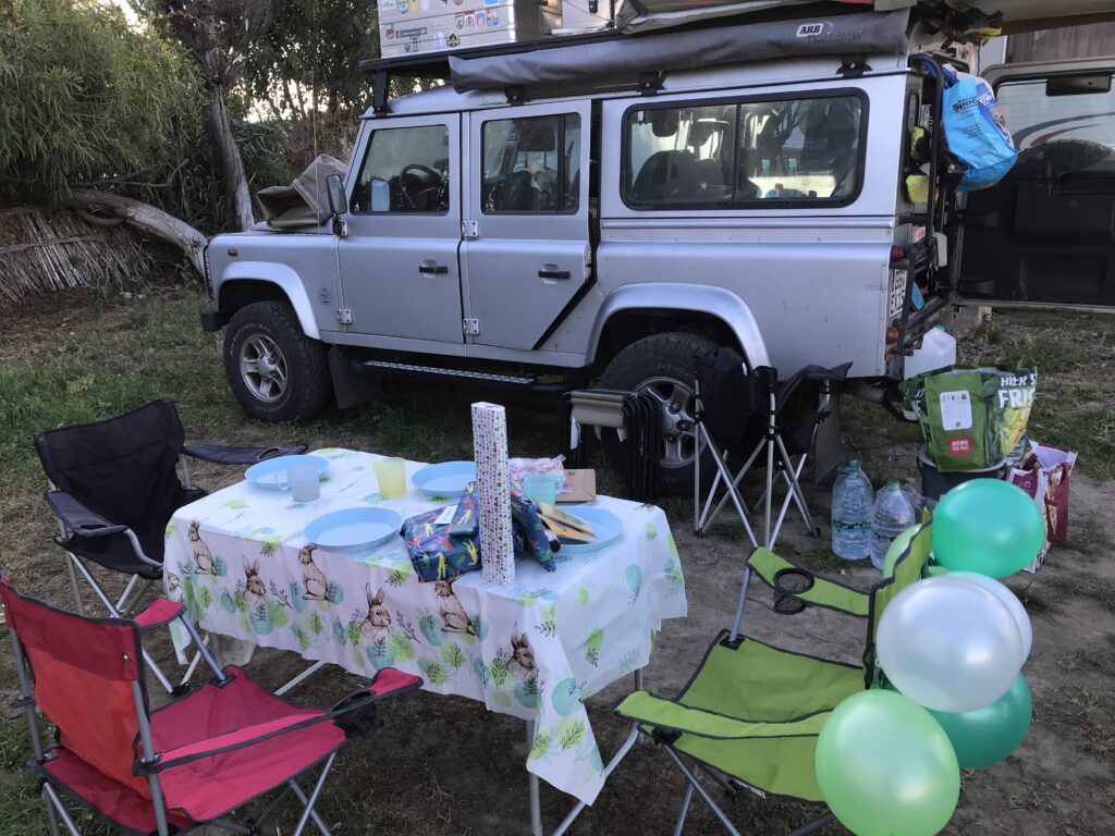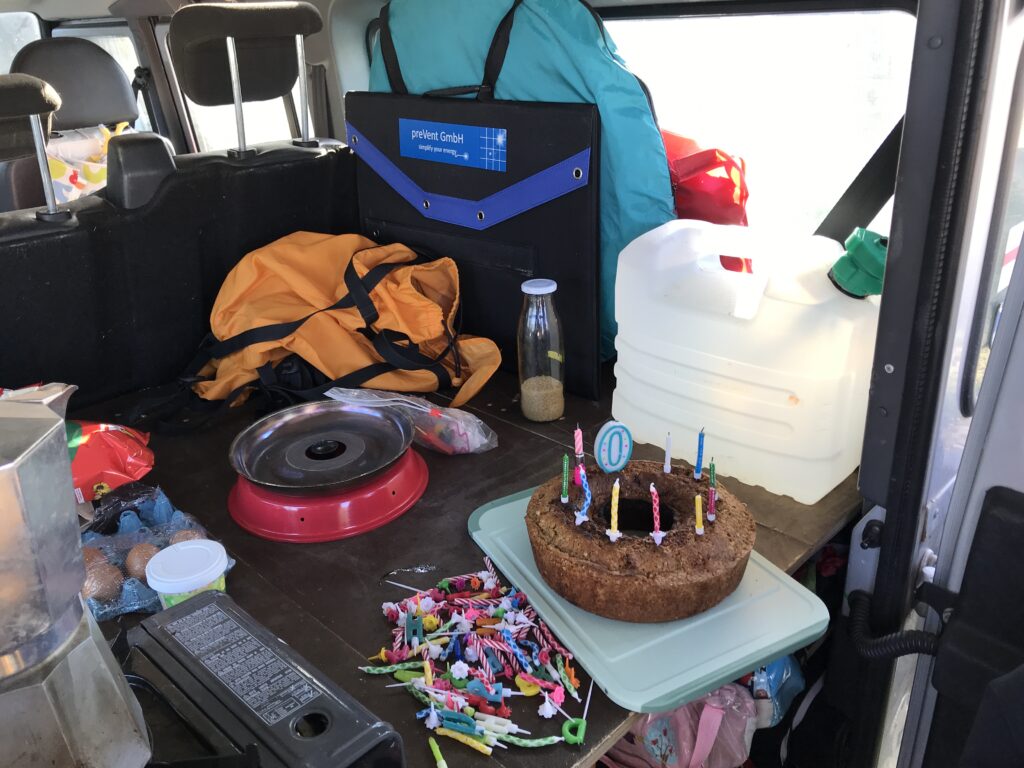 Heute ist Henrik‘s Geburtstag. Wir stehen etwas früher auf und backen Kuchen und bereiten alles für eine kleine Party vor. Heute bleiben wir stehen und werden einen ruhigen Tag mit Party, Geschenken und Sandburgen verbringen.