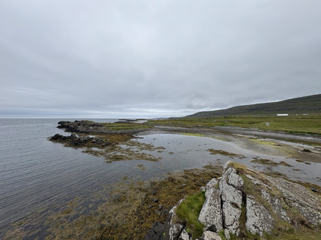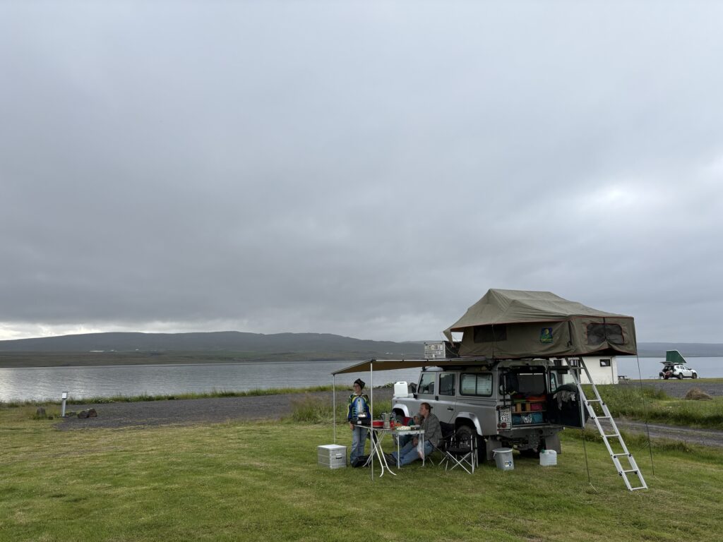 Danach geht’s auf der 72 weiter auf die Ringstraße. Da es schon in den Abend geht fahren wir noch bis Sæberg Camping. Eine flache Wiese mit tollem Blick über den Hrútafjördur.