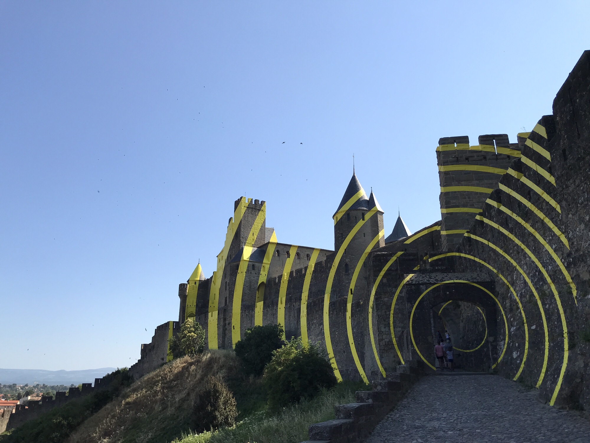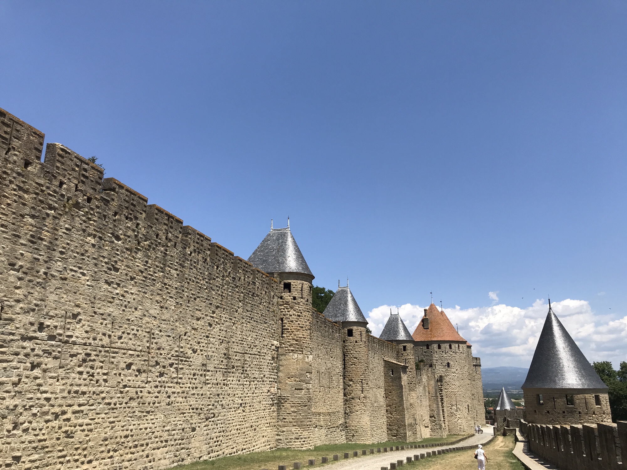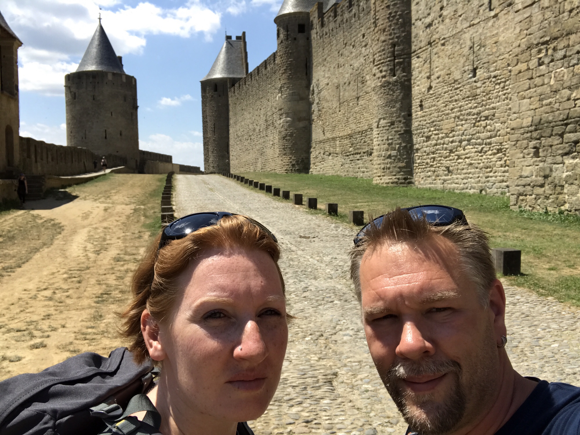 Es ist schwül und wir schwitzen ordentlich. Oben angekommen eröffnet sich der wundervolle Blick auf die Cité und auf Carcassonne.