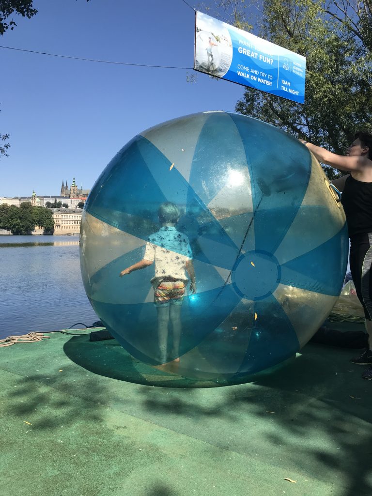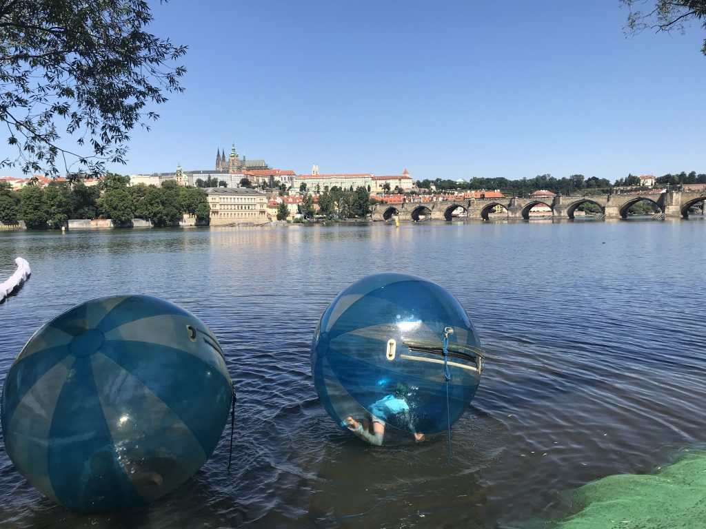 Wir fahren wieder zur Karlsbrücke und gehen erst ein Stück die Moldau entlang. Wir wollen den Tag mit einer kleinen Kinderaktion starten. Dem Zorbing.