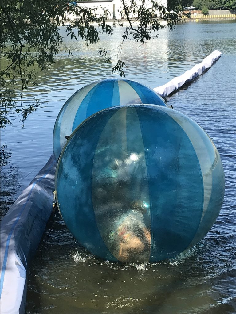Zorbing ist hier sich in einen mit Luft gefüllten Ball einschließen zu lassen und dann auf der Moldau Purzelbäume zu machen ohne naß zu werden. Hört sich lusitg an? Ist lustig.