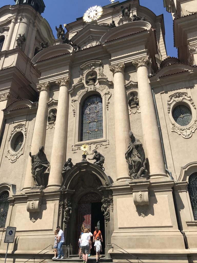 Nach 10 Minuten Spaß geht’s dann nach links weiter in den Trubel. Es sind heute sehr viele Menschen unterwegs und das Viertel in dem wir uns bewegen ist doch sehr touristisch geprägt. Überall Gold-, Silber- und Schmuckgeschäfte. Dazu viel Böhmisches Kristall. Es nervt ein bißchen. Aber ab und zu trifft man dann doch auf Juwelen, wie witzige Kunst oder kleine offene (und kostenfreie) Kirchen.