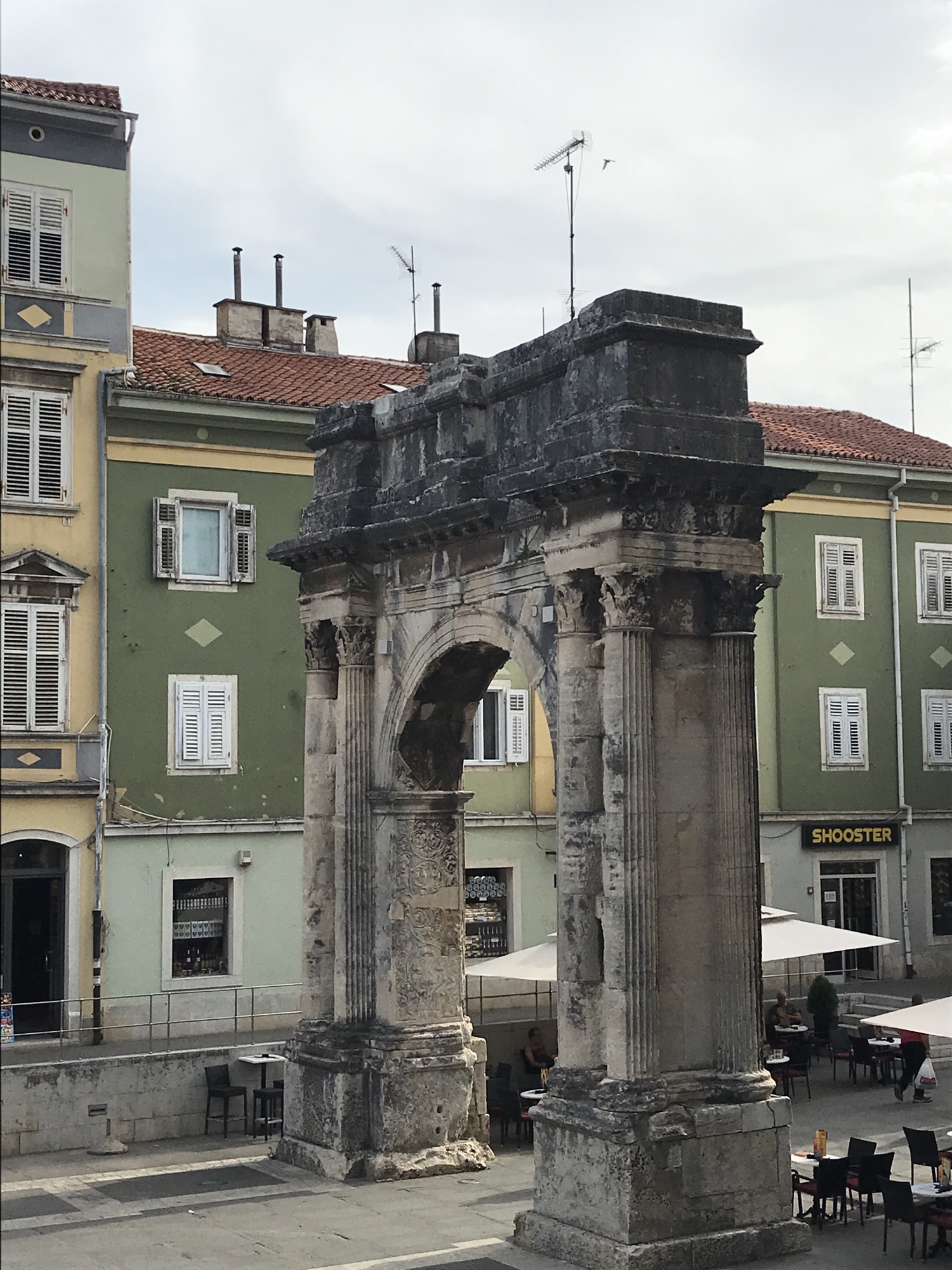 Als Nächstes kommen wir an einen Triumphbogen vorbei und wir laufen weiter Richtung höchstem Punkt in Pula.