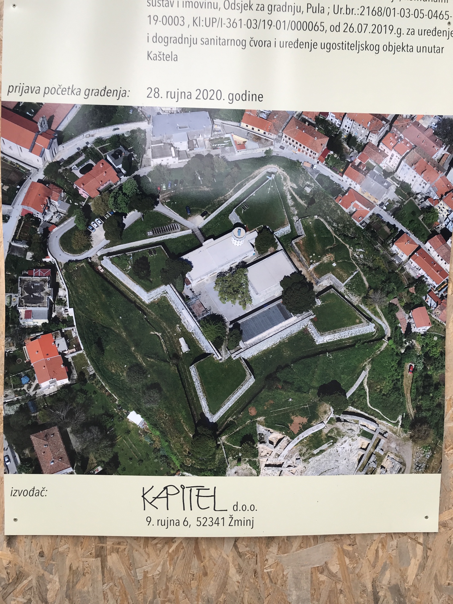 Nach einer Stunde Fahrt über die Küstenlandstraße erreichen wir den Ortskern und haben das Glück direkt am Amphitheater einen Parkplatz zu finden. Da ich nicht im Besitz von genügend Kleingeld bin wird das Parkticket ziemlich umständlich per Handy gekauft. Nach dem Bezahlvorgang (75 Kuna) fällt mir ein Tippfehler im Kennzeichen auf. Naja wird schon nichts passieren, man muss ja auch den Fahrzeugtyp und Farbe angeben…