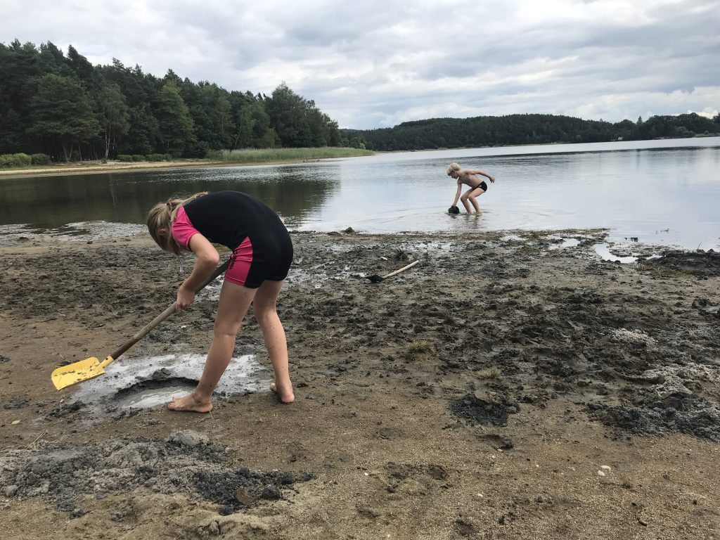 Der Platz leigt direkt an einem See und der wird gleich von den Kids in Beschlag genommen.