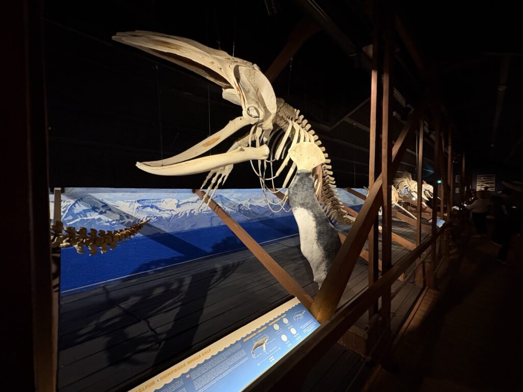 Am nächsten Tag sind wir ziemlich lange müde und brauchen um in die Gänge zu kommen. Frühstücken und dann noch mal duschen und Camp abbauen. Wir rollen auf einen Parkplatz und gehen zum Whale Museum. Eine kleine aber feine Ausstellung rund um die Wale.