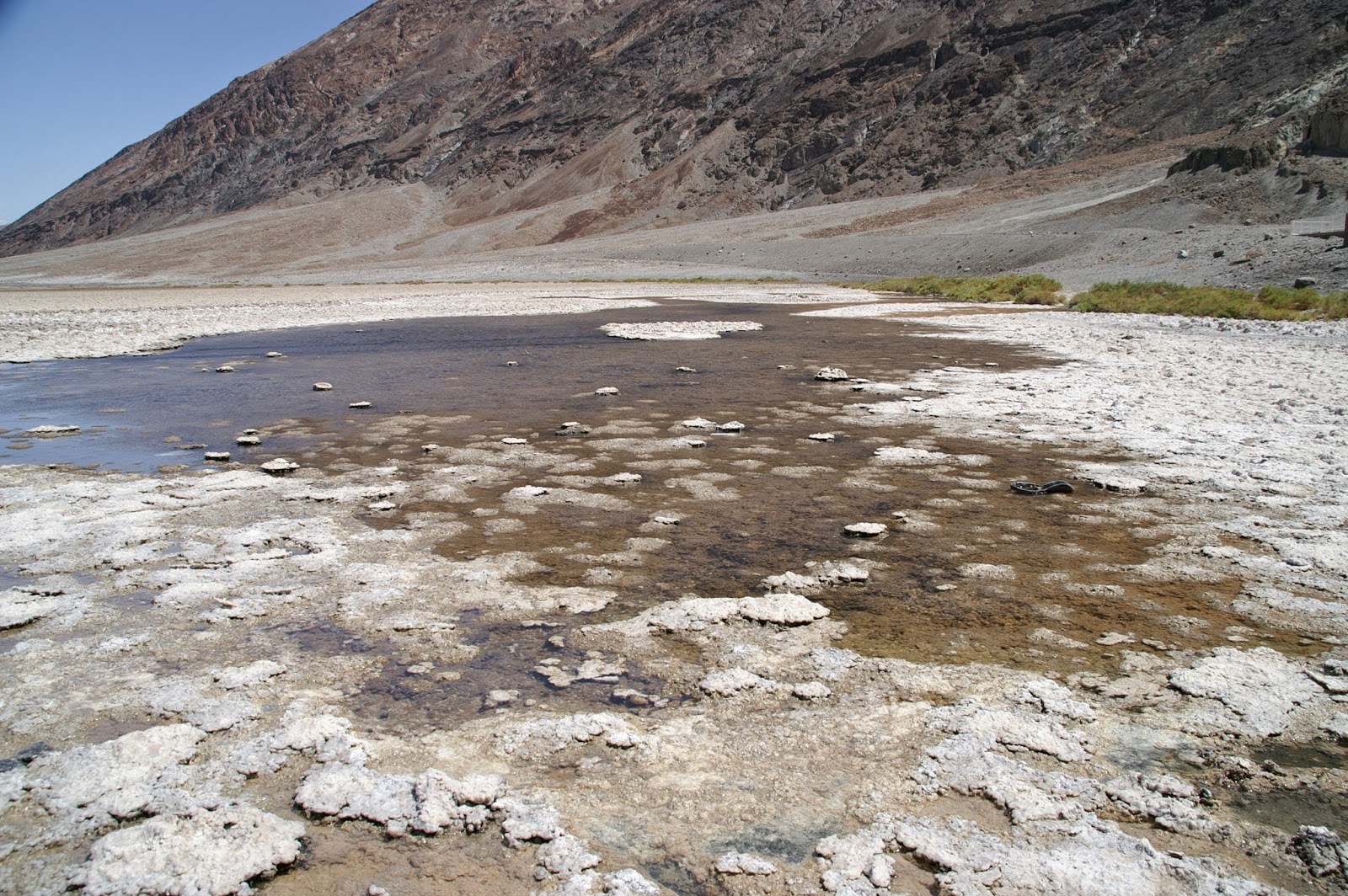 Verrückt an Badwater ist die Herkunft des Namens: Unter dem Valley gibt es einen unterirdischen Flusslauf, der hier an die Oberfläche kommt und nie austrocknet. Und er ist total salzig. Somit „schlechtes Wasser“.